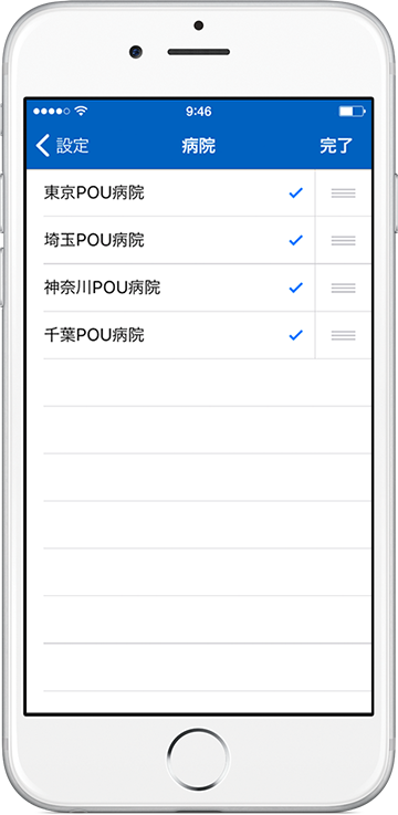 メインメニューの「設定」から「病院データベース」を開き、右上の「編集」をタップすることにより、選択と並び替えができるようになります。